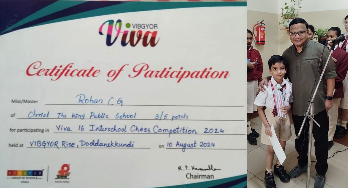 Rohan C G of grade 1 C participated in the Viva Interschool chess competition held on the 10th of August 2024, at Vibgyor Rise, securing the 5th place.
